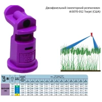 AI3070 - це двофакельний розпилювач, розроблений компанією TeeJet, який забезпечує ефективне внесення фунгіцидів та боротьбу з хворобами зернових культур. Він створює дві плоскоструменеві розпилювальні моделі під кутами 30° та 70° відносно горизонталі. Нахилена на 30° струмінь проникає крізь рослинний покрив, а 70° струмінь забезпечує краще покриття насіннєвих шапок.